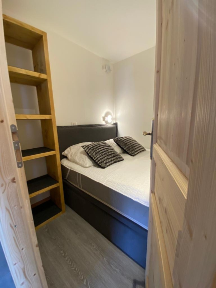 BEDROOM 1: bedroom cabin, 1 double bed (140cm), wall hooks, 5-shelf pull-out column.