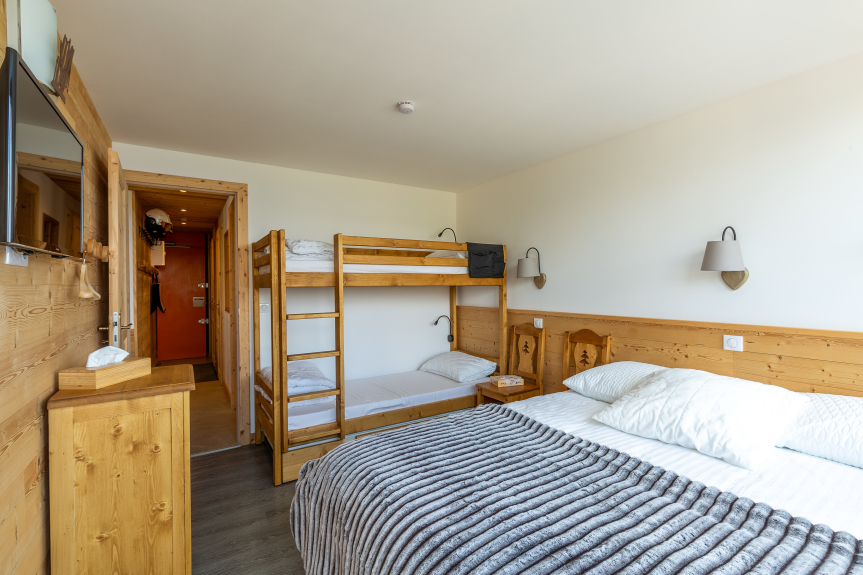 BEDROOM 2: family room 1 double bed (160cm), wall-mounted flat-screen TV, 1 bunk bed (80cm) + 1 pull-out trundle bed (80cm), 3-drawer chest of drawers, 2 chairs/shoes, wall-mounted coat hooks, manual blackout blinds, direct access to balcony.
