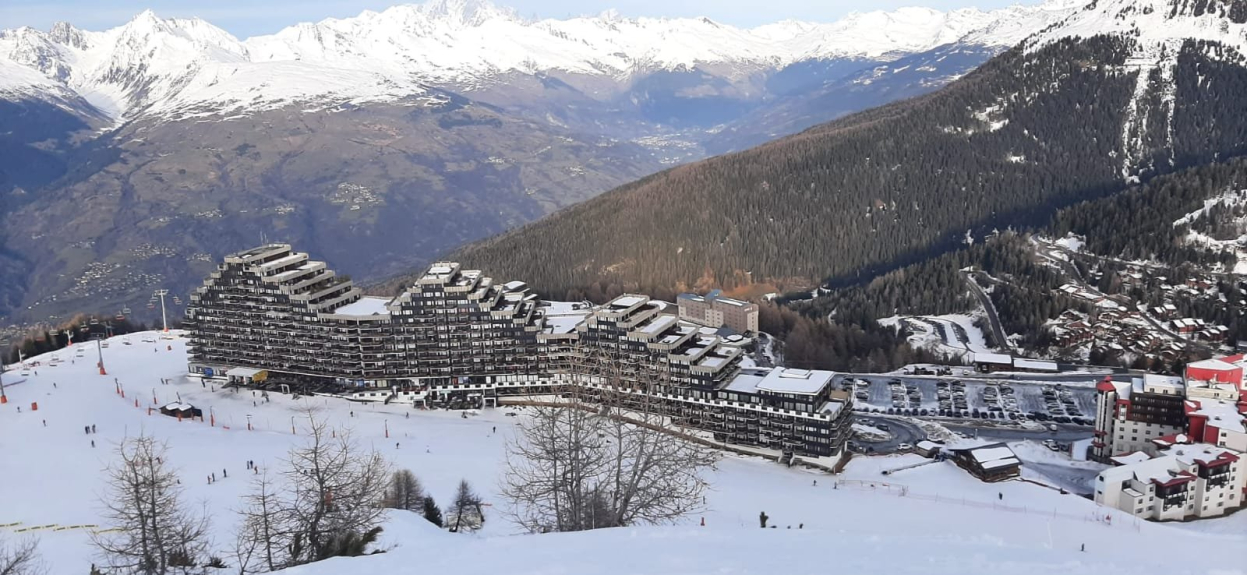 This iconic building (also known as the "Paquebot des Neiges" and listed as a 20th-century architectural heritage site) is located at the foot of the slopes, with direct departures to 4 different directions and resorts. It boasts an indoor shopping mall with all its shops, leisure facilities and services on board (restaurants, bars, equipment and equipment rental, mini-market, bakery, souvenir store, ESF, real estate agency, caterer, tourist office, etc.) and is also linked to Plagne Centre resort by the Télémétro (free service every 6mns).