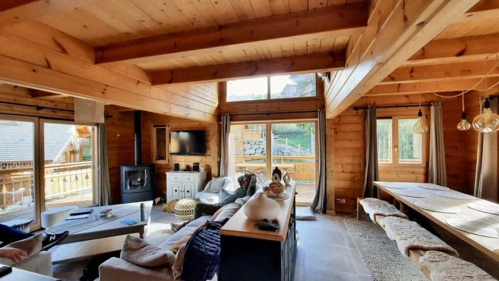 A spacious, bright living room with two large sofas, armchairs and poufs, a wood-burning stove, a warm, friendly dining area, a modern, well-equipped kitchen, 6 bedrooms (2 on the ground floor and 4 upstairs), 4 shower rooms, 1 bathroom (with balneotherapy bath), a sauna, a state-of-the-art ski room, 2 large garages.