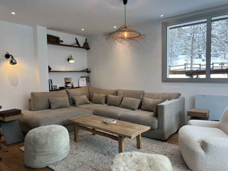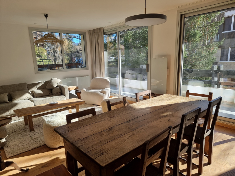 A bright living room opening onto a sunny balcony, with a view of the slopes.