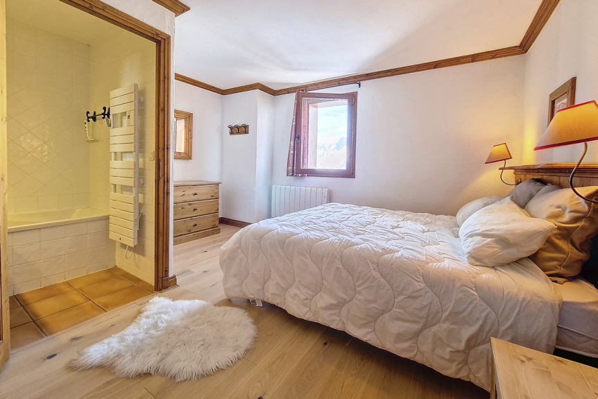 Spacious duplex apartment offering beautiful spaces with a west-facing balcony giving you an incredible view of the Pointe de la Masse. The apartment is located on the slopes and has a ski locker with boot dryer. One parking space in the covered garage.