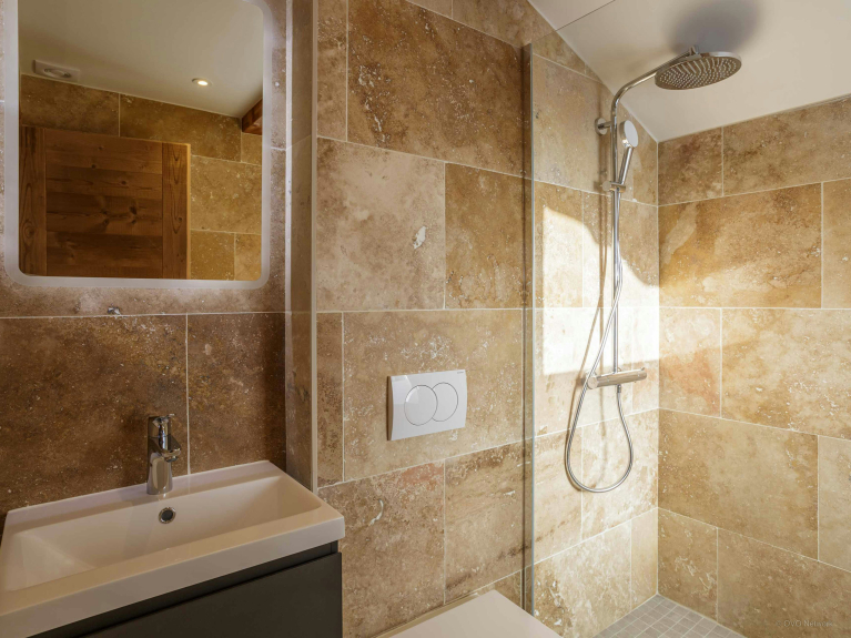 Facilities include toilets on each floor, a dishwasher in the fitted kitchen, a washing machine in the laundry room on the first floor, and a heated shoe dryer in the garage. The garage can accommodate a small car, but you'll find outdoor parking areas, covered or not, shared with neighboring chalets.