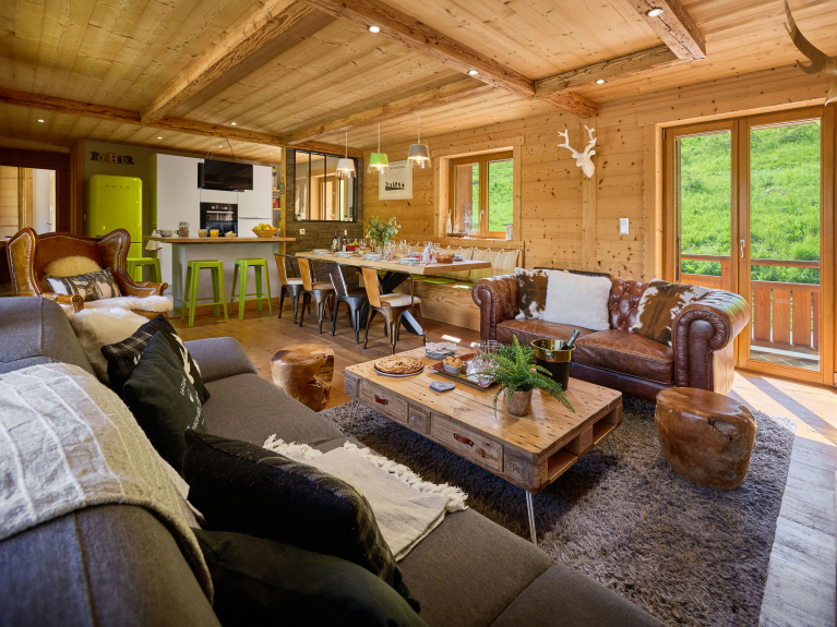 The open-plan living area includes a fully equipped kitchen, a spacious dining table, and a comfortable sitting area with two sofas and a TV. A gas fireplace creates a cosy atmosphere. French windows open onto the covered terrace on one side, and onto the balcony on the other, from where you can watch the dance of the ski lifts.