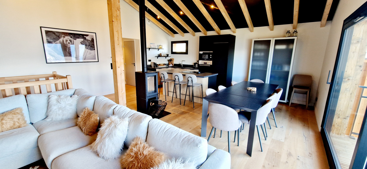 a living room with television, and wood stove, balcony access with extraordinary views of the mountains and Mont Blanc.