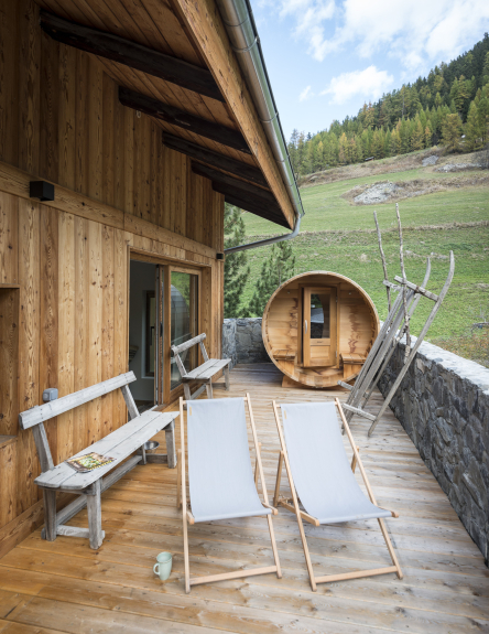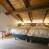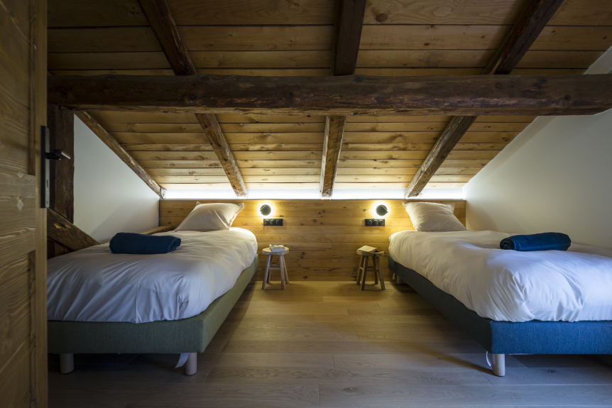 The main part of the chalet has the other five bedrooms, with eight single beds and a bunk bed, perfect for large families or groups of friends. There is also a large, cosy lounge with a fireplace, and a large terrace with a sauna for relaxing after a day on the slopes. Access to the second floor is via a steep staircase, adding to the chalet's authentic charm.