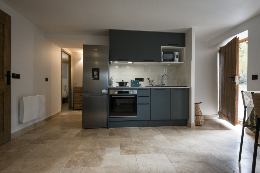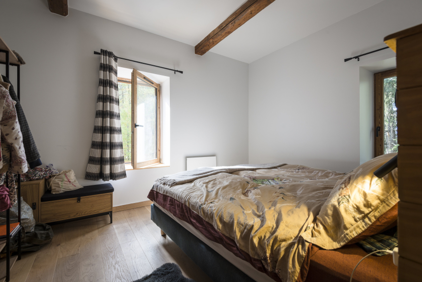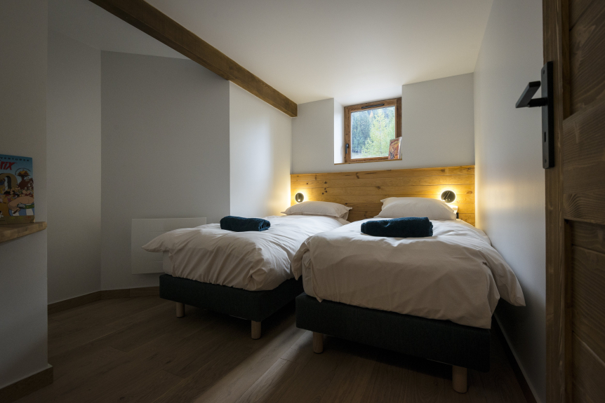 The chalet is divided into two independent sections. The first, on the ground floor, is a flat with two bedrooms, a kitchen opening onto the living room, a bright living area and a shower room. Ideal for a self-catering holiday or to accommodate an extra family.