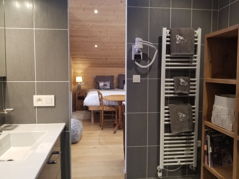 This spacious living area combines all the qualities of a charming 4-star chalet, combining the antique character of mountain furniture with the contemporary comfort of a mountain chalet.