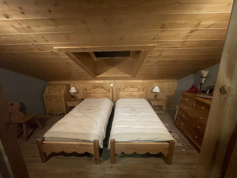 The master bedroom has 140cm bedding. The second bedroom has two 90 cm single beds.