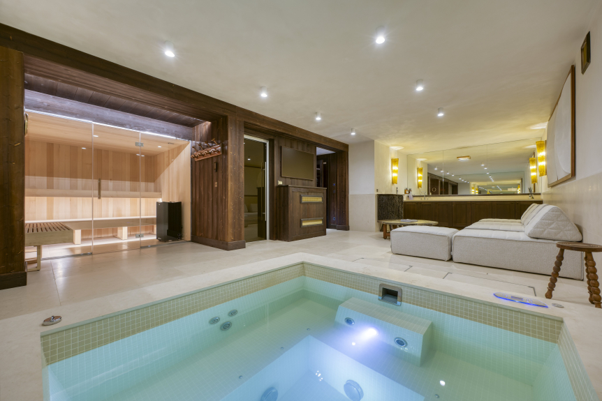 access to the wellness area with a large jaccuzzi for 8, bench seat.