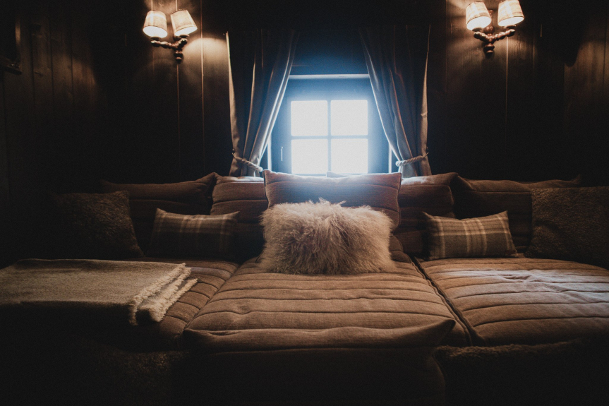 1 large 70 m2 cocooning living area with large bench facing the fireplace, bar,