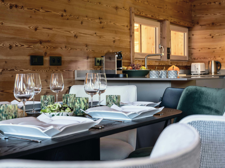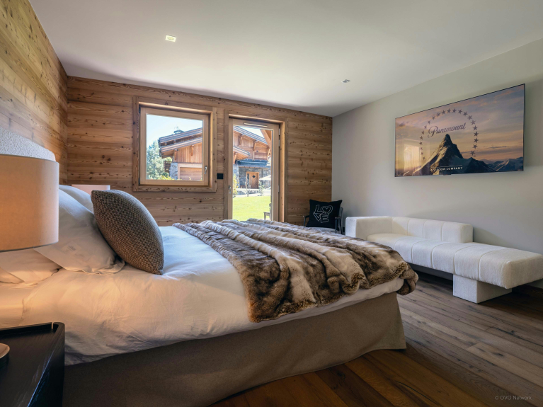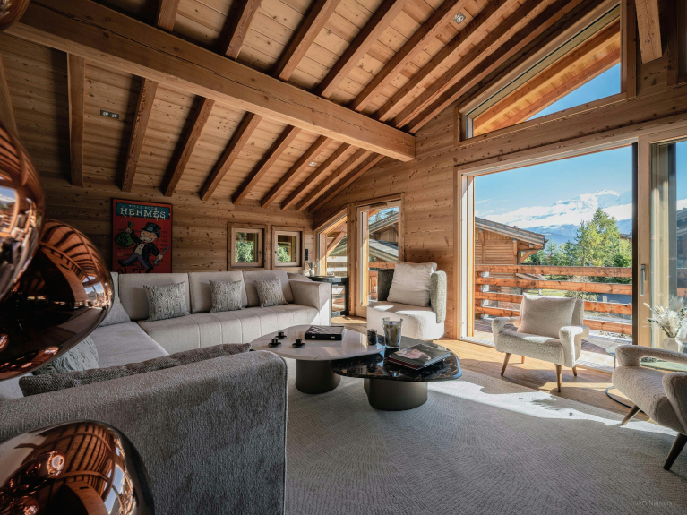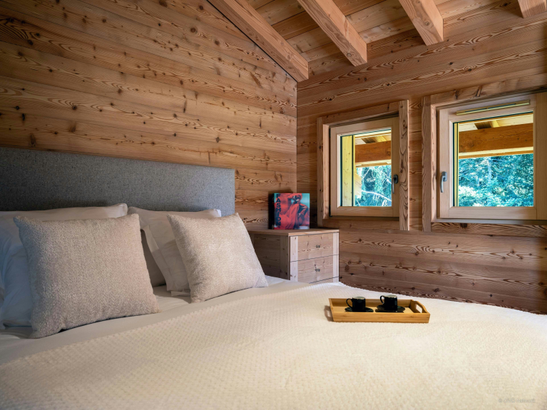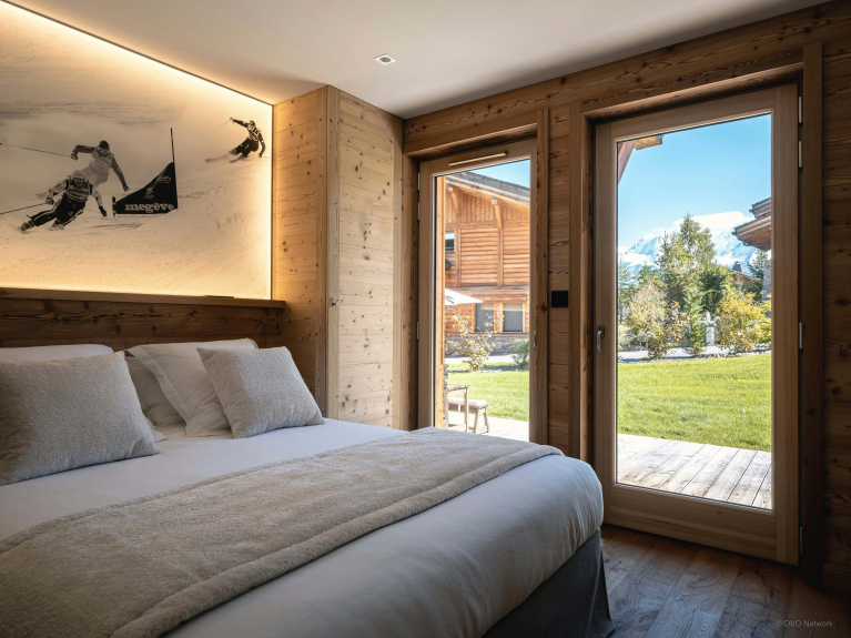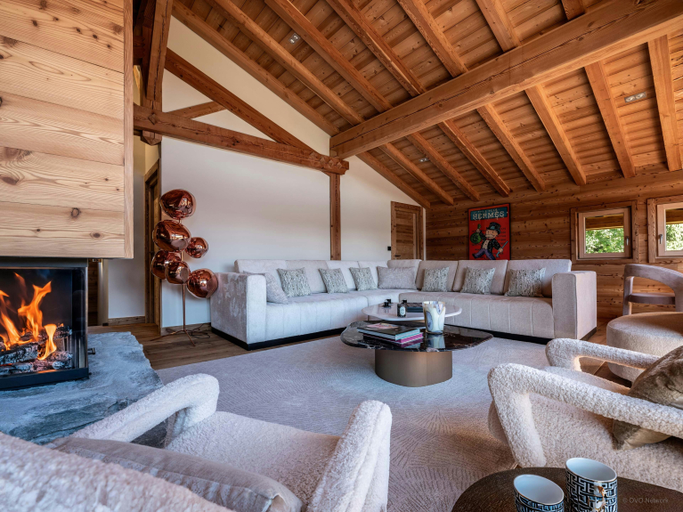 The spacious living room on the top floor is particularly welcoming, with comfortable armchairs and sofas, a central fireplace and plenty of natural light. Large bay windows open onto a balcony with views of the Mont-Blanc massif.