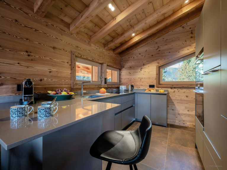 You won't find a TV in the living room, but a comfortable cinema room has been set up on the garden level. This level also includes the wellness area, with sauna and steam room for relaxing at the end of the day, as well as a functional ski room and laundry room with washing machine and dryer.