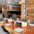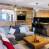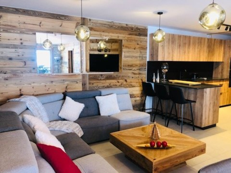 A beautiful living room features a fully-equipped kitchen (hob, dishwasher, coffee maker, oven, microwave and raclette machine), a dining room and a sitting area with an electric fireplace.