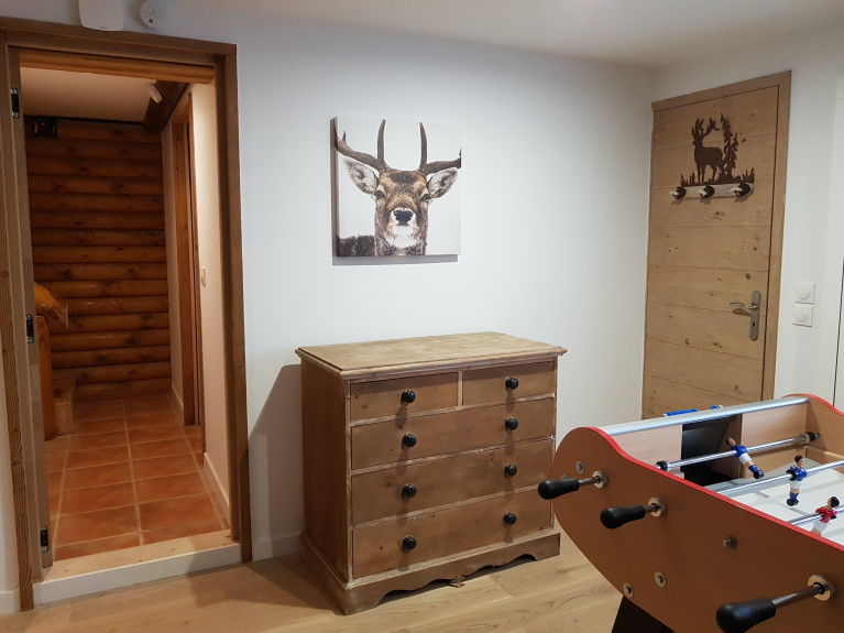 Entrance with WC and washbasin. 55m2 living room with 2 comfortable lounges with fireplaces, opening onto a 25m2 terrace overlooking the lake and slopes. Fully equipped open-plan kitchen with bar. Mezzanine with TV, games and reading area.