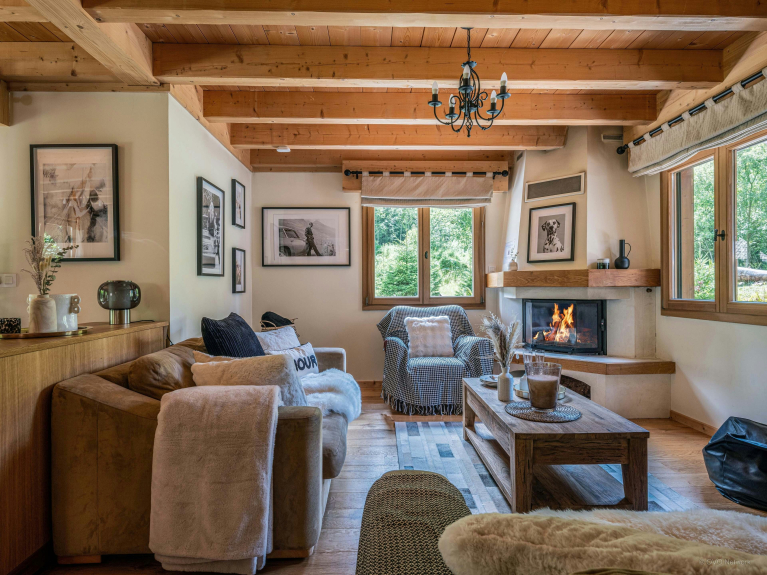 The first floor houses the main room, bathed in natural light. The living room is very comfortable, with sofas arranged around the fireplace. It opens onto a convivial dining room and a well-equipped kitchen. The ski room with heated boot dryer near the entrance is very practical in winter.