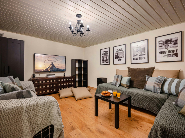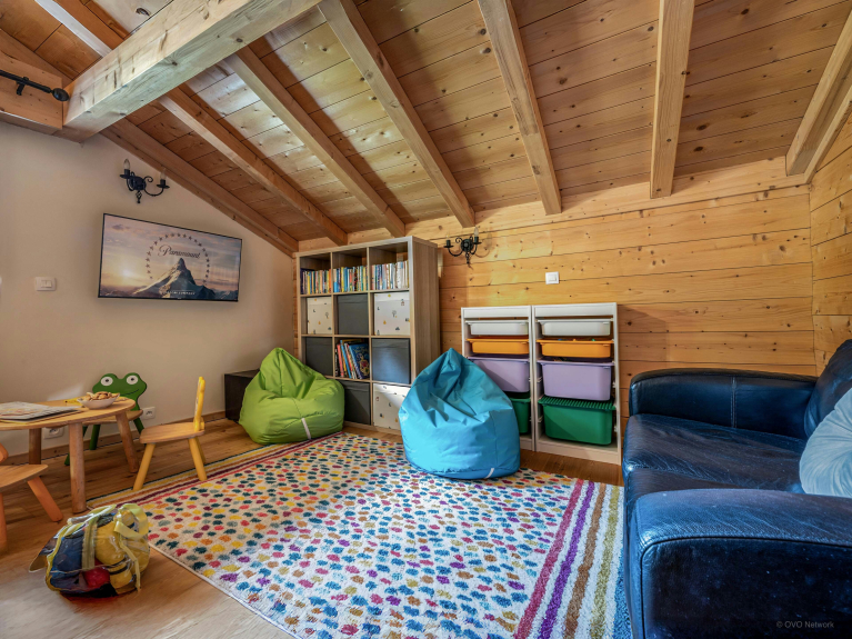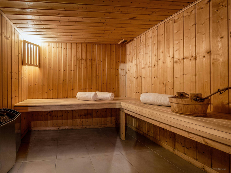 On the garden level, a family room combines a double bed and two bunk beds, with a separate shower room and toilet. An additional lounge with games console and TV is on the same level, as is a sauna and spacious laundry room with washing machine and dryer. This layout makes Chalet Evelyn the ideal choice for one or two families.