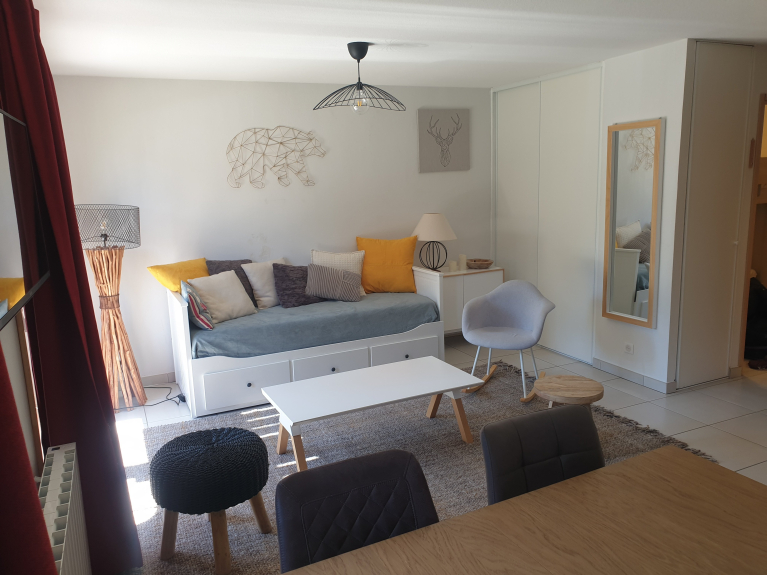 This place is set up for 4 people : 2 bunk beds and a sofa bed, on the top of a ski locker are waiting for you.
