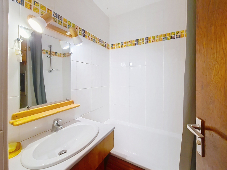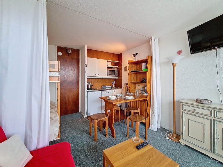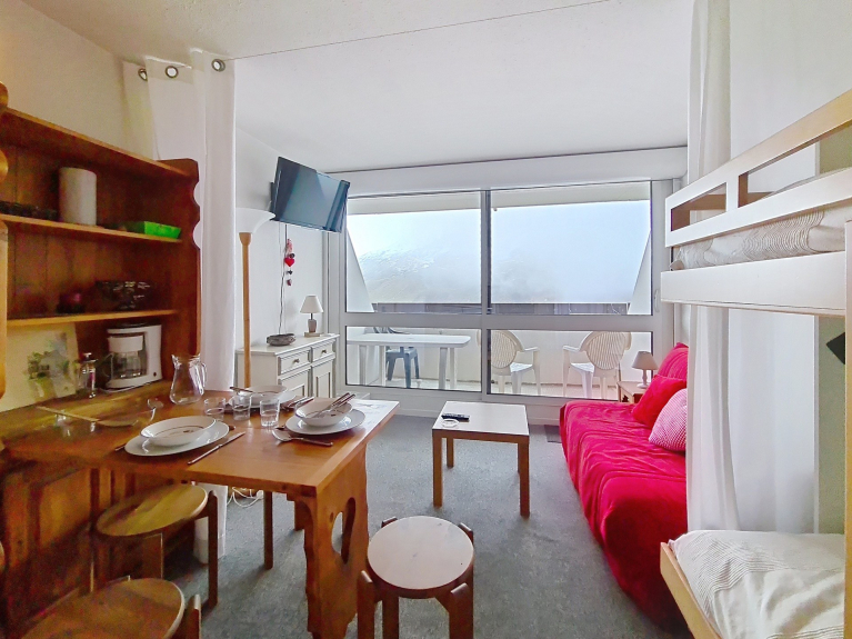 Bright 19m² studio apartment with magnificent mountain views for three people. Located on the 13th floor with elevator. Private ski locker.