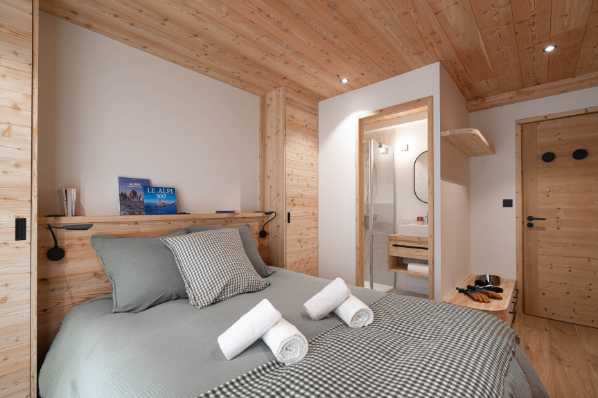 - Bedroom 4 (2nd floor): 4 single beds 90×190 with private balcony, 2 of which can be combined to form a double bed (Ecrins view) and 2 children's beds under the slopes.