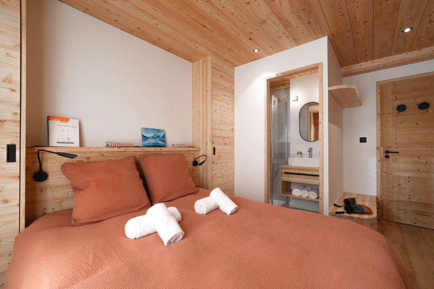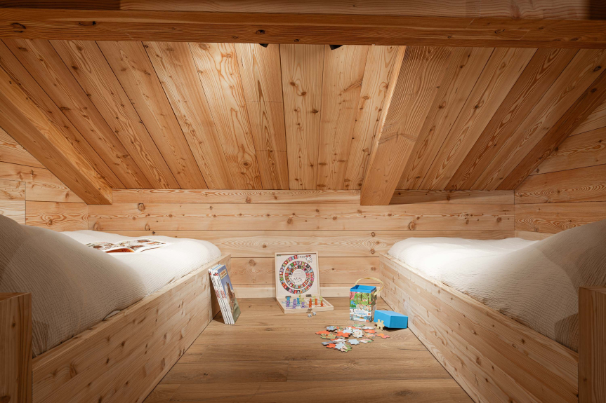 - Bedroom 4 (2nd floor): 4 single beds 90×190 with private balcony, 2 of which can be combined to form a double bed (Ecrins view) and 2 children's beds under the slopes.
