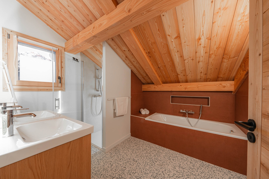 - Bedroom 3 (1st floor): master suite with double bed 160×200, walk-in shower and large bathtub (mountain view).