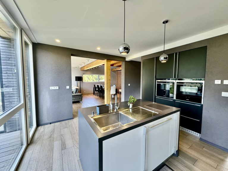 - Fully-equipped kitchen with central island opening onto terrace.