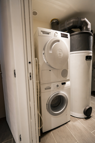- Laundry room with water heater, washing machine and tumble dryer
