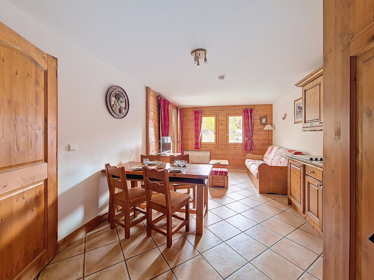 This residence, located at the entrance to the resort, captivates with its traditional Savoyard style. Come and discover its functional apartments, relaxation area with swimming pool, sauna, hammam, fitness room, ski store and free shuttle service to the resort center, 1km away.