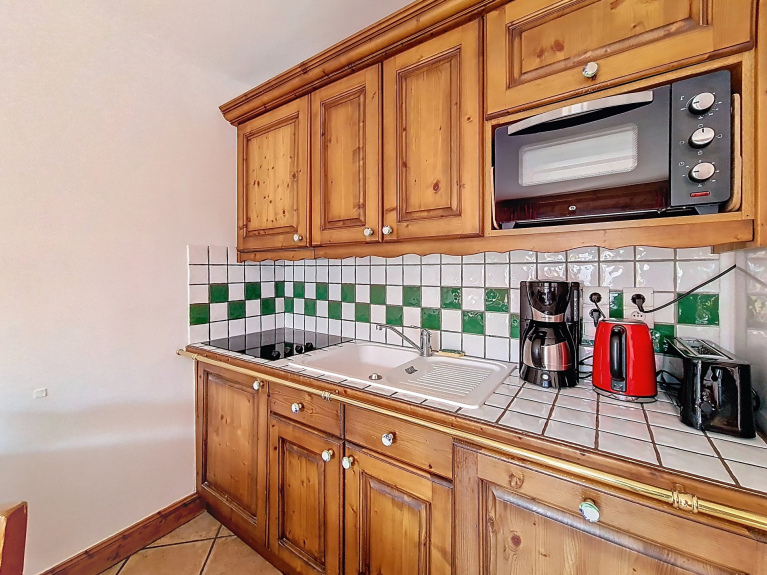 Open-plan kitchen equipped with 4 ceramic hobs, hood, fridge, microwave, mini-oven, dishwasher, coffee maker, toaster, kettle.