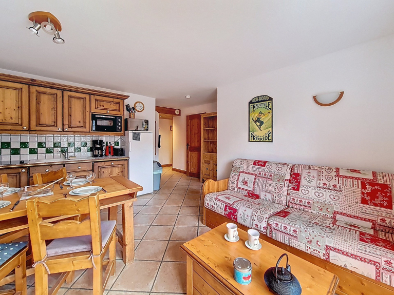 This residence, located at the entrance to the resort, captivates with its traditional Savoyard style. Come and discover its functional apartments, relaxation area with swimming pool, sauna, hammam, fitness room, ski store and free shuttle service to the resort center, 1km away.