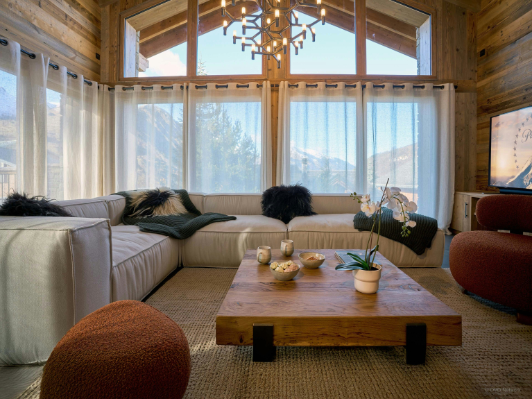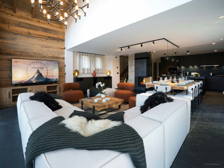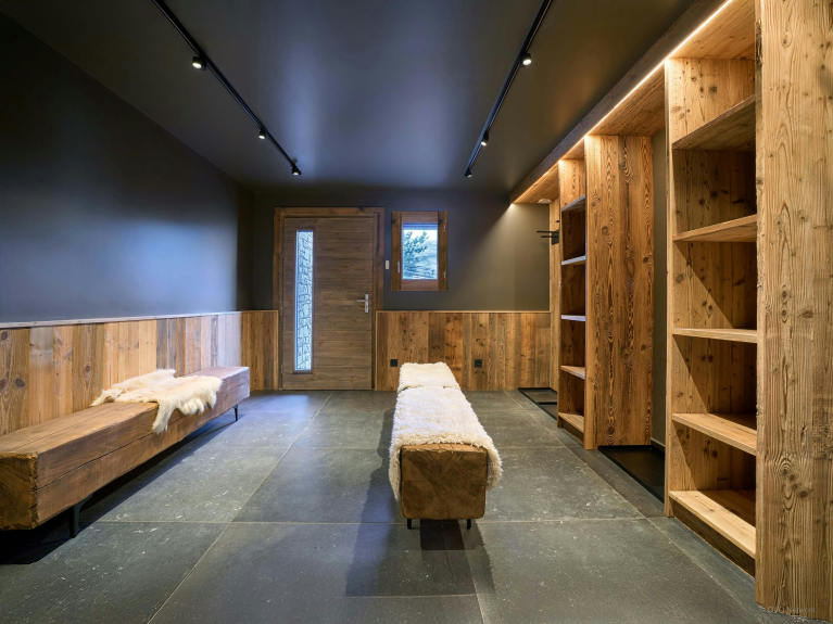 The entrance is via a highly functional ski room, equipped with a heated boot dryer, and accompanied by a laundry room with washing machine and tumble dryer. So you can make yourself comfortable as soon as you arrive, before warming up by the fireplace in the living room.
