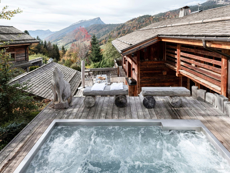 A panoramic terrace extends the communal space. A large convivial table, outdoor sofa and Jacuzzi facing the peaks: everything here inspires relaxation. As if that weren't enough, there's also a sauna on this floor.