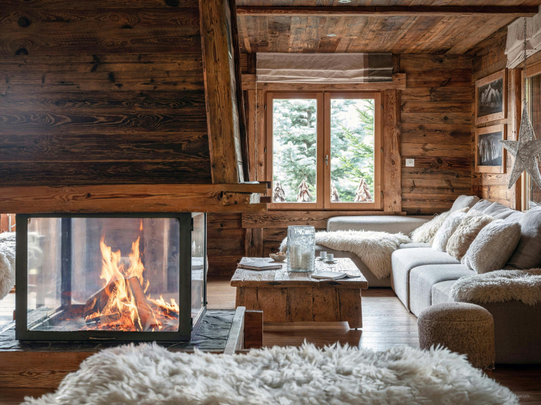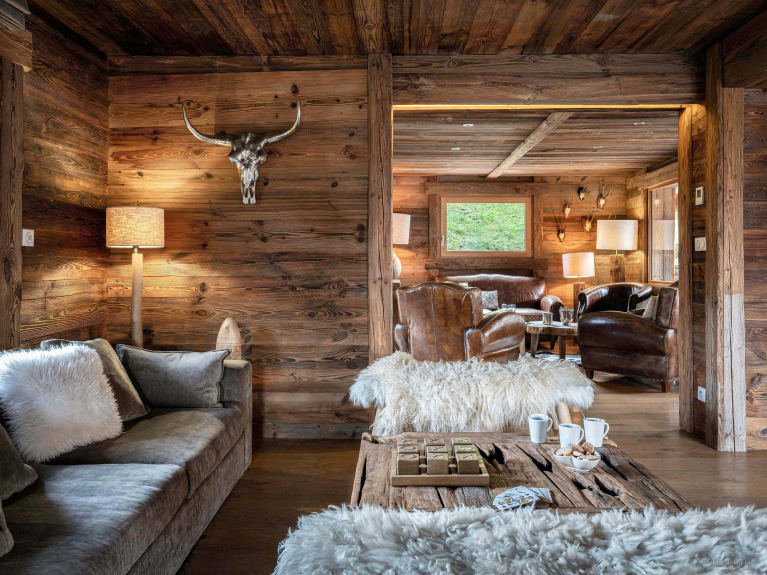 The middle floor is the heart of the chalet. It features a vast, elegantly decorated living room, divided into two lounges and warmed by a central fireplace. A second lounge offers a more intimate atmosphere, ideal for reading or sharing a drink. The kitchen is fully equipped and the dining table is spacious.