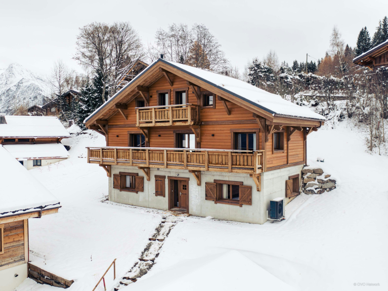 In the heart of Le Bettex, on the heights of Saint-Gervais-les-Bains, this chalet offers the impression of a luminous refuge facing the mountains. It's a place where you can breathe, where every room seems to have been designed to take full advantage of the landscape. From the living room to the bedrooms, you can see the Aravis mountains, the Mont-Blanc massif and the Arve valley.