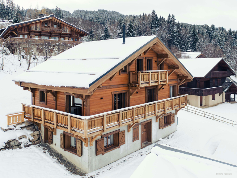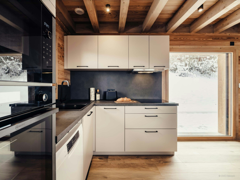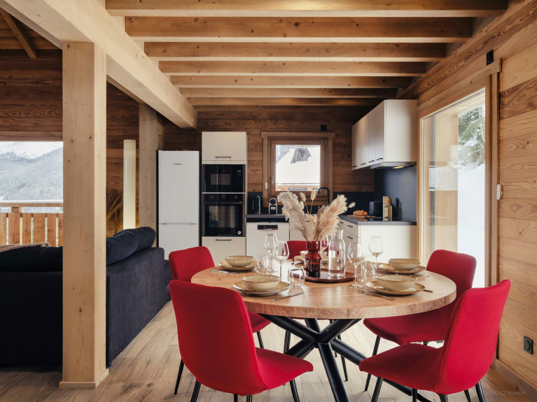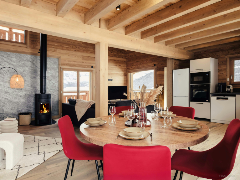 The heart of the chalet is the panoramic living room on the central floor. Bay windows wrap the space in light, a balcony runs along two sides and the wood-burning stove will warm up winter evenings.