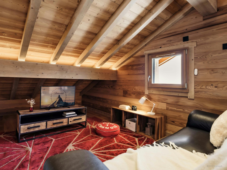 The upper floor will quickly become the children's den, with a bedroom tucked away under the rafters, a TV room for quiet times and a balcony from which to admire the mountains.