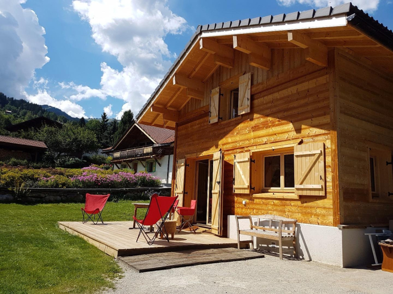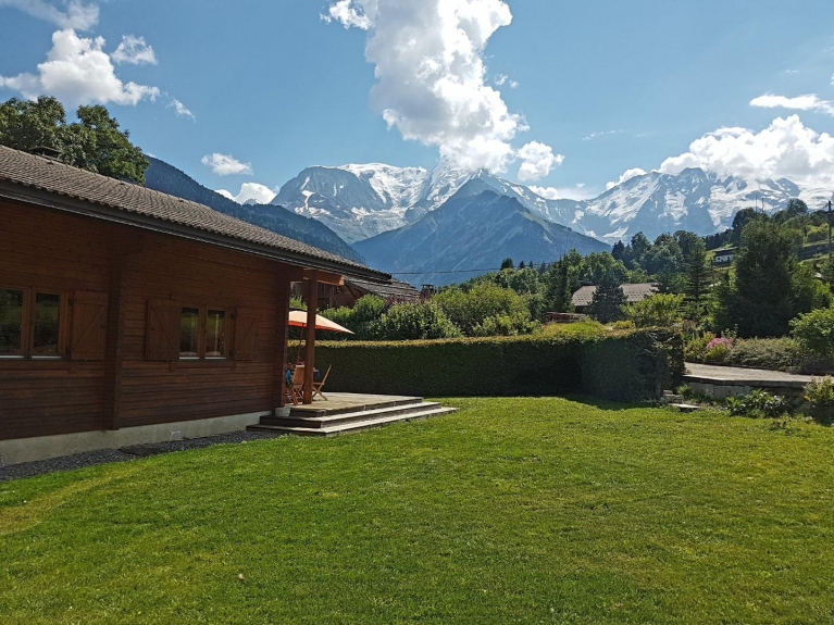 Norwegian style wood chalet, 100m2, suitable for 8 people, with a terrace offering breathtaking views of the Mont-Blanc mountain range and valley.