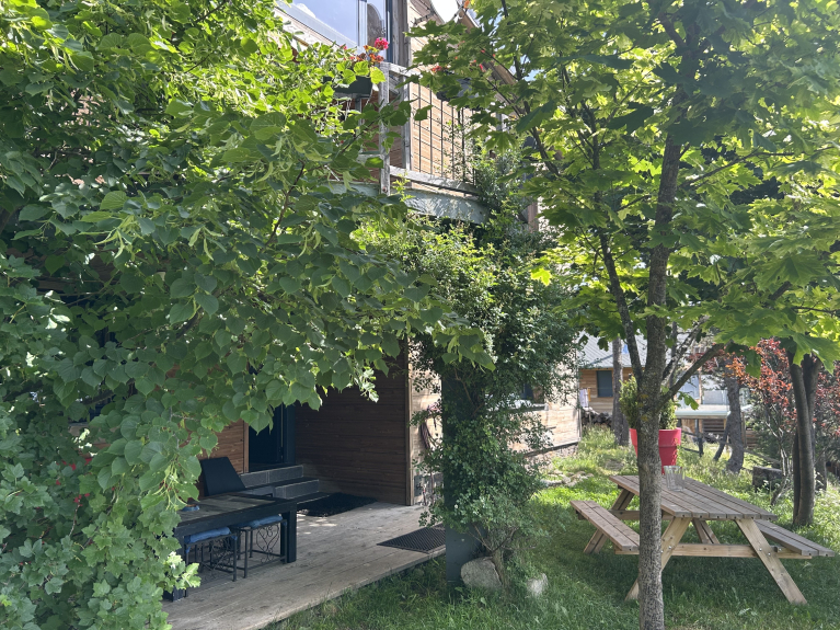 The unfenced garden has a terrace of 20 m2 with a covered area.