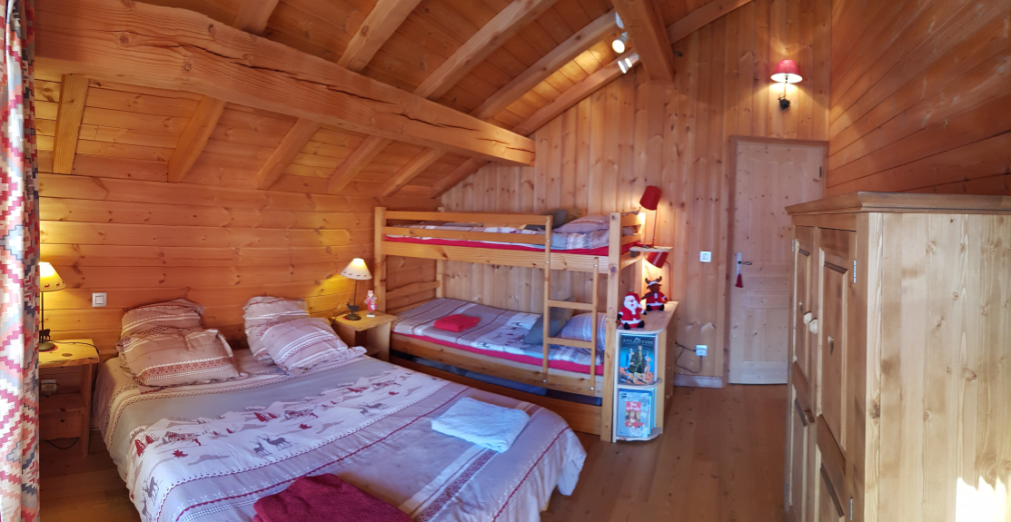 1 bed room 1st floor et 3 bedrooms at the 2nd floor. 2 bathrooms, 2WC. One big bed room (26m²) in the 2nd floor is the kids and teenagers paradise with uncreadible view of the mountain, board games, films, real table soccer.