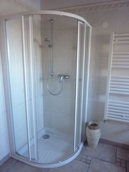 - En la planta baja de la parte del chalet situada encima de un piso independiente que no se alquila: entrada - lavadero - dormitorio principal con cuarto de ducha - sala de estar con cocina abierta, comedor con mesa grande y salón con estufa de leña - 2 aseos independientes - baño con bañera de esquina y ducha - balcón