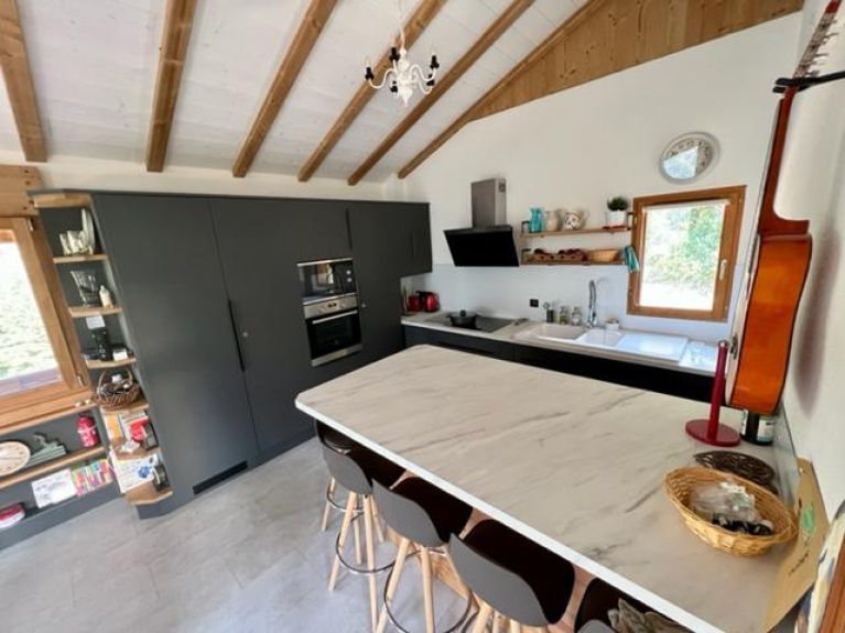Al borde del bosque, con una vista excepcional de la Vanoise, el chalet es particularmente tranquilo y agradable, rodeado de abetos. Está totalmente equipado para 10/12 personas y se ha beneficiado de numerosas mejoras en el último año.En la temporada de invierno, el viaje de vuelta por la pista de Saint Anne se puede hacer en esquís hasta el chalet. Este chalet está organizado como un dúplex con la parte de día en el primer piso de aproximadamente 50m² y el espacio de noche en la planta baja de una superficie equivalente. En la primera planta hay un gran salón y un cuarto de ducha con WC y un lavadero con lavadora/secadora: Una cocina totalmente equipada (horno y microondas, campana extractora, vitrocerámica, lavavajillas, nevera grande y mucho espacio de almacenamiento), barra americana con 6 sillas altas, una sala de estar con dos sofás, uno de los cuales se convierte en una cama (150 cm), sillones, TV, reproductor de DVD (así como muchos DVD, juegos y libros), WIFI gratuito, una mesa para 10/12 personas. La habitación dispone de una estufa de leña con hogar visible (troncos disponibles en el balcón). Hay un doble acceso directo al balcón de unos 20m² con bancos, sillones y una mesa. Un techo alto proporciona un volumen amplio y numerosas ventanas y miradores lo hacen muy luminoso con una vista panorámica excepcional.La planta baja dispone de cuatro dormitorios, un cuarto de baño y un WC separado, así como un armario: Dormitorio 1: gran ventanal, cálida pared de madera, cama de matrimonio (1 cuna disponible) y armario doble; Dormitorio 2: gran ventanal, dos camas individuales (que pueden convertirse en cama de matrimonio), armario y un pequeño armario; Dormitorio 3: Equipado nuevo en otoño de 2018, cómodo y práctico sofá cama rapido con puente de cama y armarios, literas (litera superior no recomendada para menores de 6 años) con cama nido, consola y videojuegos; Chb4: acogedora habitación con cálidas paredes de madera, cama de matrimonio de 140x185, multitud de estanterías de almacenaje.Ropa de cama, almohadas y edredones nuevos (12 almohadas, 5 edredones individuales y 5 edredones de 220x240), así como algunos plaids.