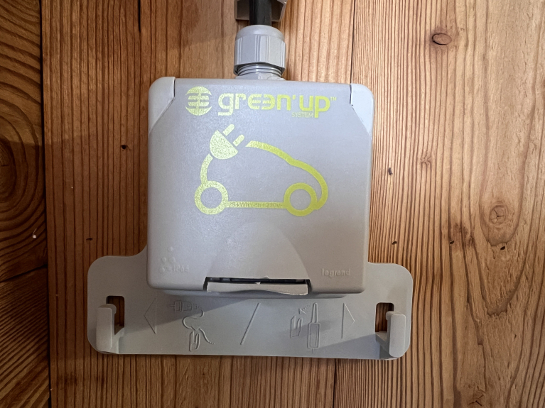 Garaje para un coche, recarga eléctrica con enchufe GREEN UP para vehículos híbridos, tres plazas de aparcamiento en la calle de fácil acceso.