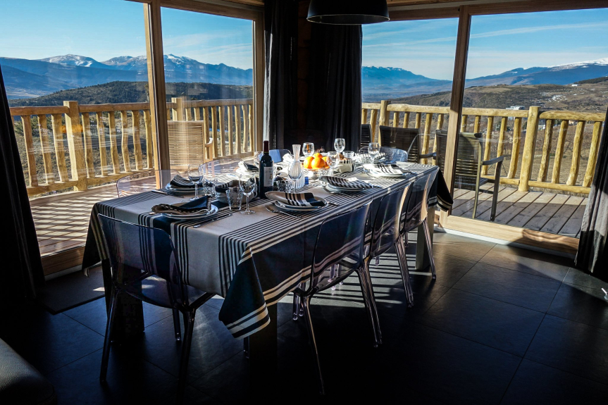 Excepcionales vistas ininterrumpidas de 300° sobre el Canigó, la meseta de Cerdán, Andorra y el Capcir, con una vista en primera línea de la Sierra del Cadí. Terrazas panorámicas, con plancha eléctrica en verano