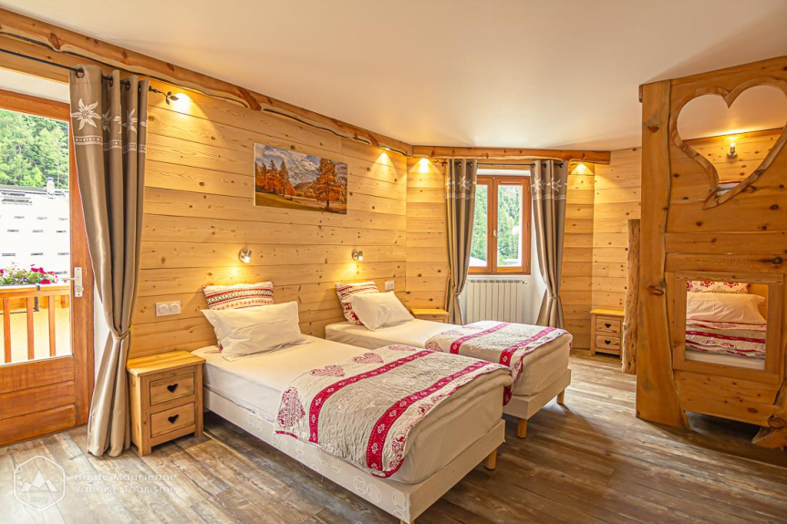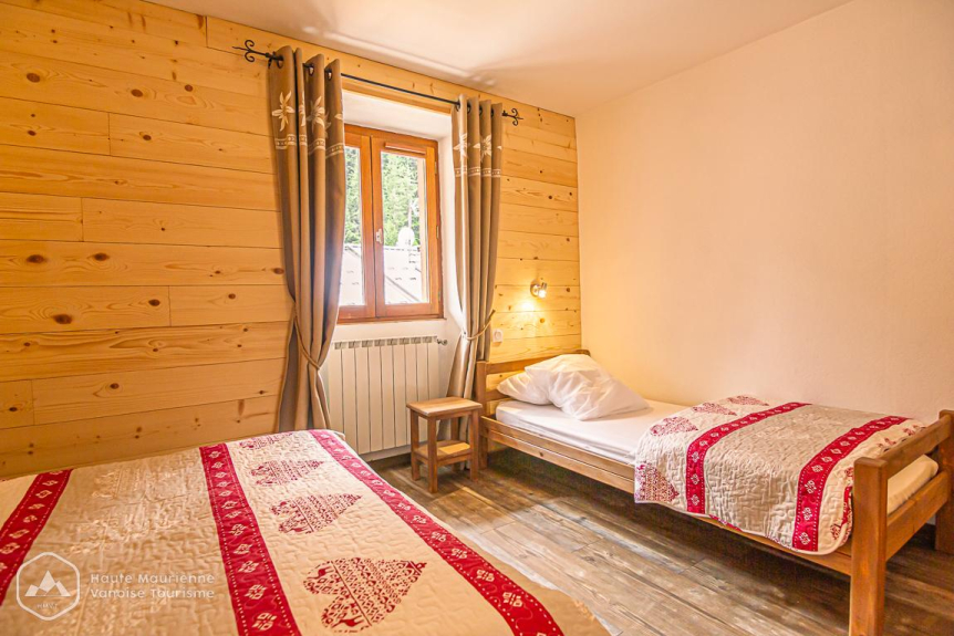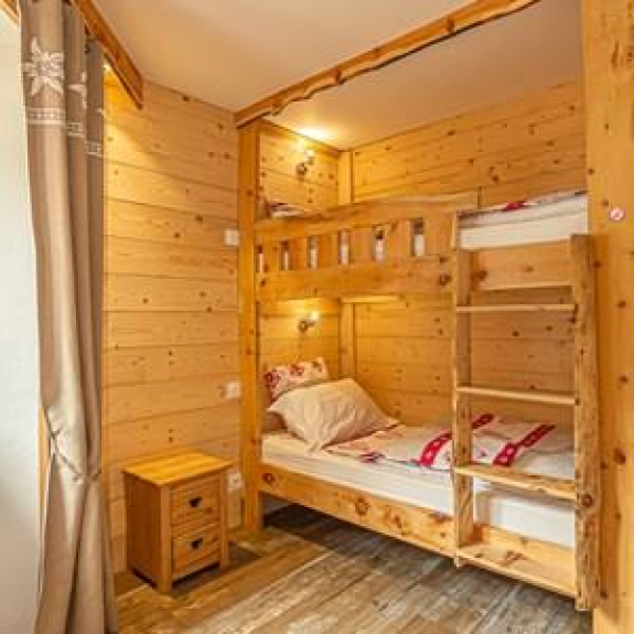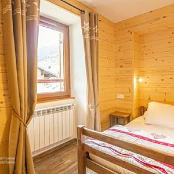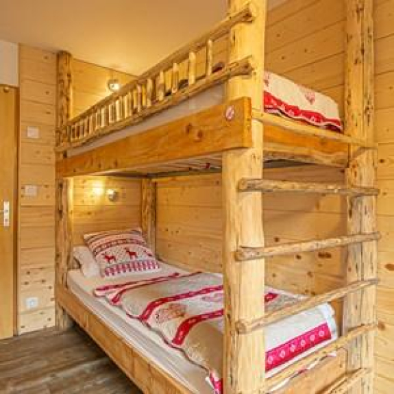 - un dormitorio con 2 camas individuales de 0,90 x 200 (edredones de 160X220) y 2 literas (edredones de 140X200) equipadas con 2 almohadas por cama. La habitación tiene un armario, una mesa y sillas. Se abre a un balcón orientado al sur.