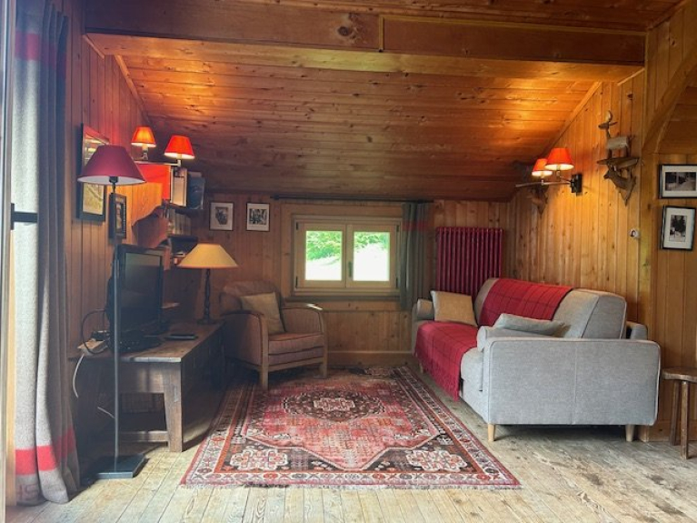 Cocina totalmente equipada (lavavajillas, etc...) con barra para tomar una copa o desayunar. Cómoda sala de estar con 2 grandes sofás (uno de ellos es un sofá cama, para 2 personas), dos grandes y acogedores sillones con vistas al Mont-Blanc, TV de pantalla plana, WI-FI.