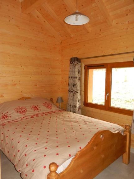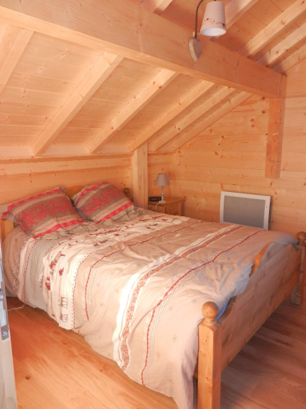 - Habitación con cama doble (1m40 con almohadas, edredón y sábanas de plástico) y armario.