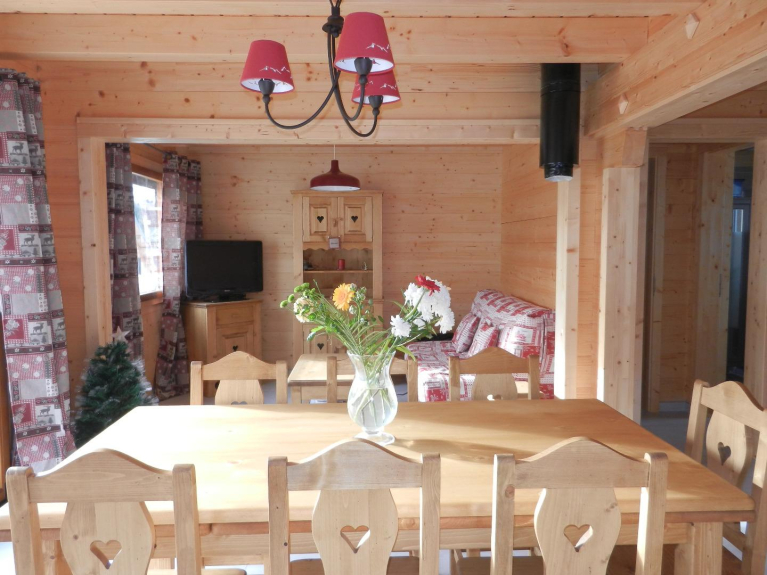 - Cocina abierta al salón, con fregadero, placa de inducción, campana extractora, lavavajillas, nevera, microondas y horno tradicional. Juego completo de vajilla y utensilios de cocina (olla a presión, cafetera eléctrica, tostadora, juego de fondue y raclette...). Armarios de almacenamiento, silla BB...