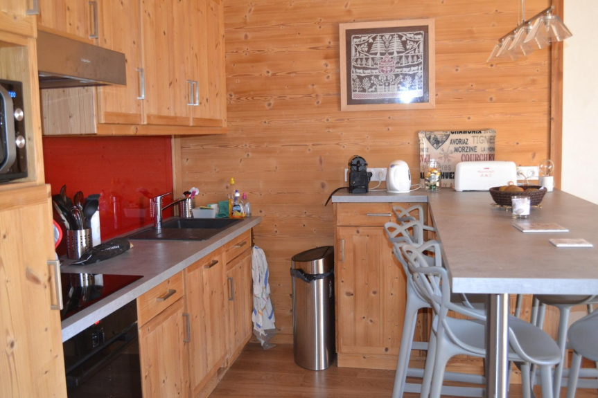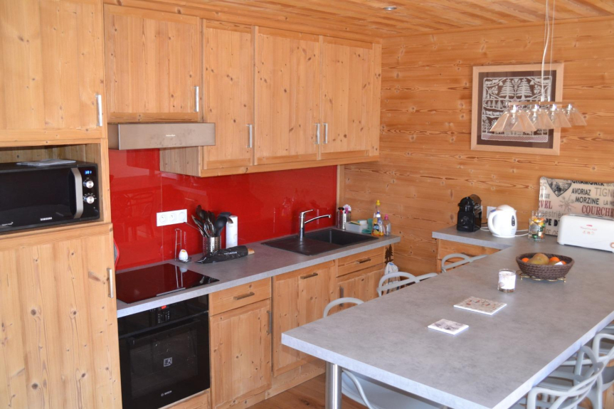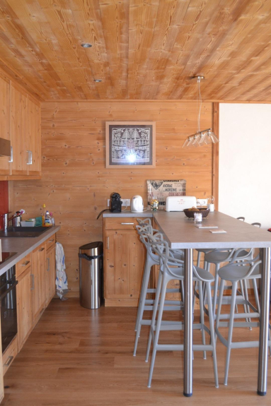 - La cocina está separada del salón por una mesa alta con 6 sillas altas y un gran balcón con una magnífica vista de los Alpes. El salón ha sido completamente rehecho invierno 2018.