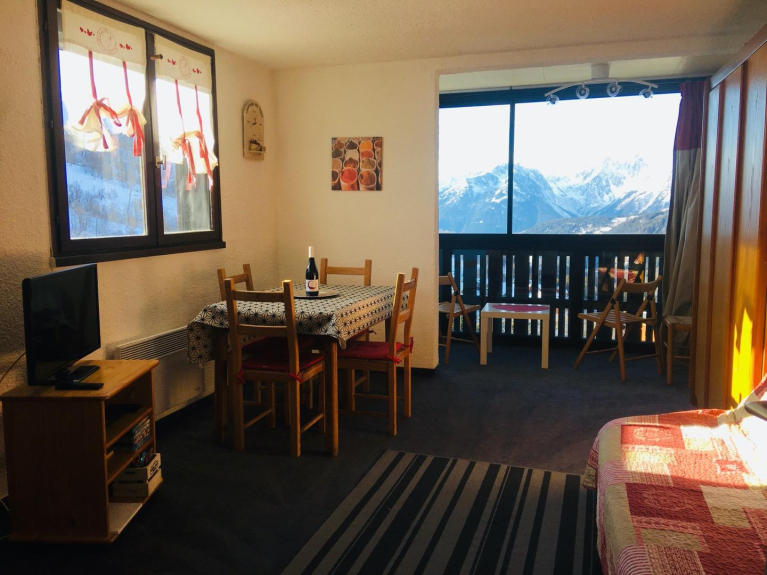 Situado en el frente de la nieve, el piso incluye una entrada con un rincón de montaña, un cuarto de baño con bañera, una sala de estar con una cocina americana bien equipada (microondas, placa eléctrica, lavavajillas, etc.), una zona de estar con un sofá cama (140x190), TV de pantalla plana y DVD, así como una cama doble plegable (140x190).Armario privado para esquís.